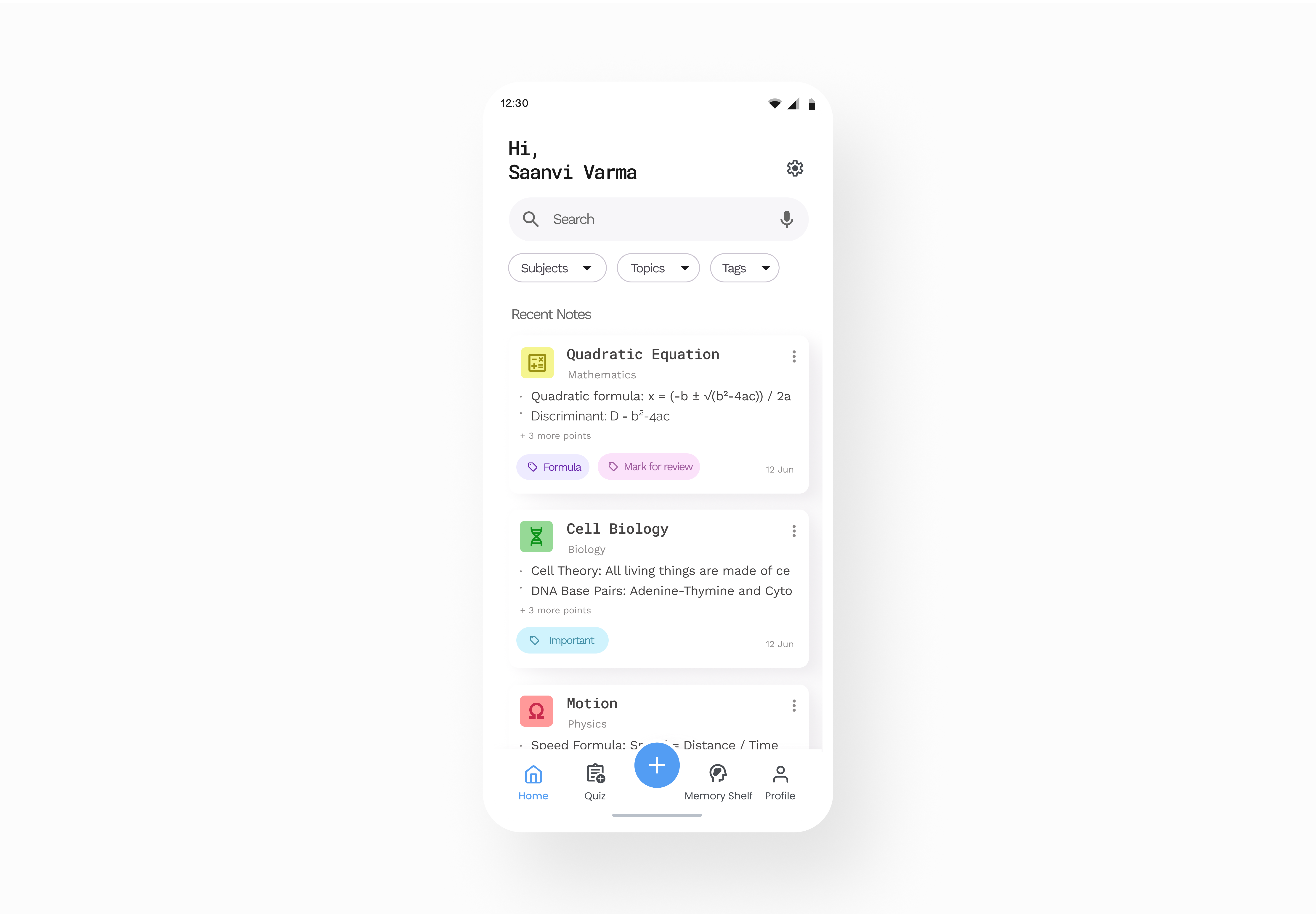 A simple study dashboard where students can see all their recent notes in one place. Greets the user and lets them quickly search for any note. Organizes content automatically by subject, topic, and tags. Filter chips help students focus on what they want to study. Each note card shows key info like subject, important points or formulas, tags, and date. Helps students quickly pick what to revise next.