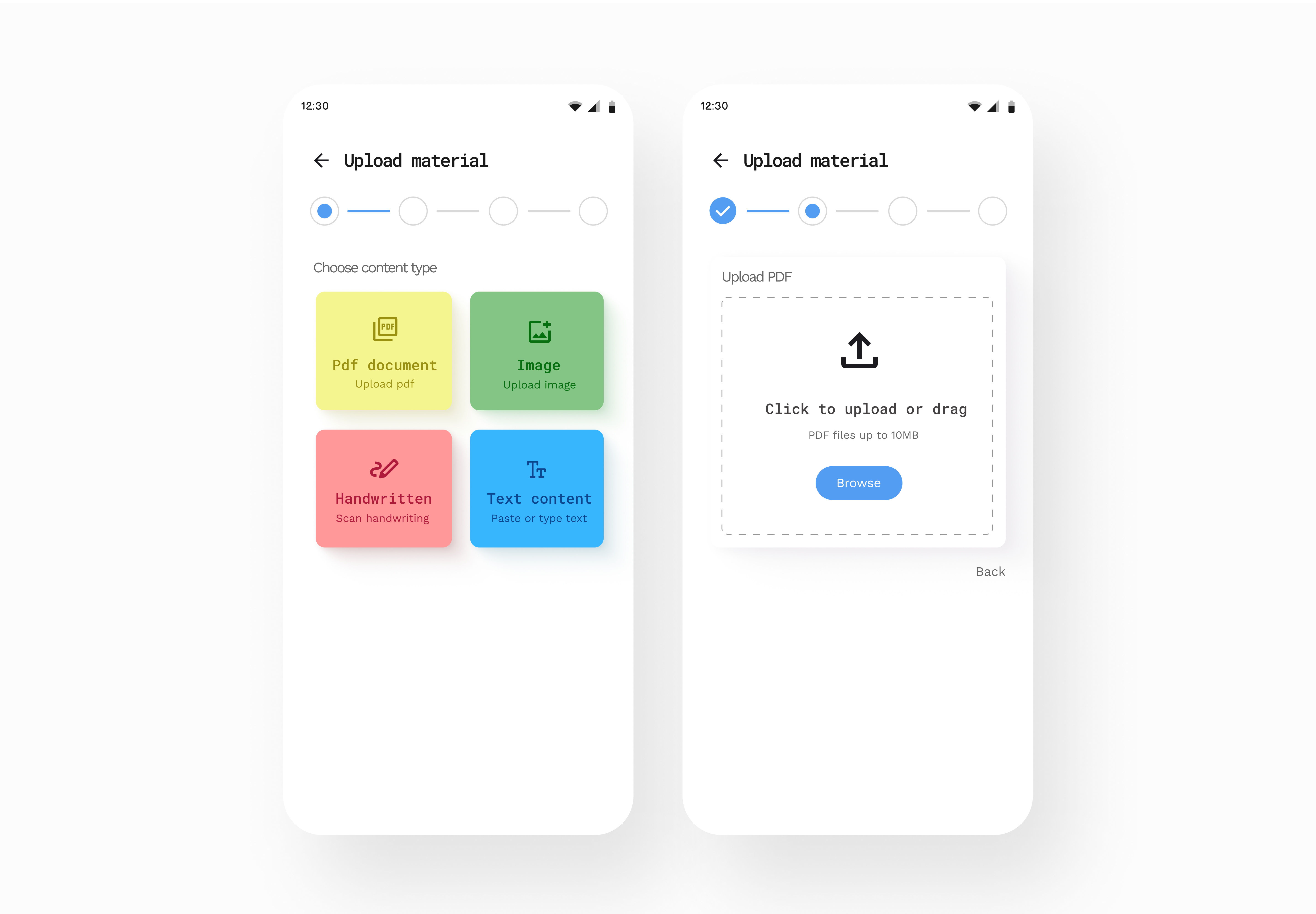 Lets students upload PDFs, images, handwritten notes, or text. Uses clear, color coded options to make choices easy. A simple step by step indicator guides them through the process. Quick browse option keeps uploads fast and low effort. Designed for mobile with large touch areas to avoid mistakes.