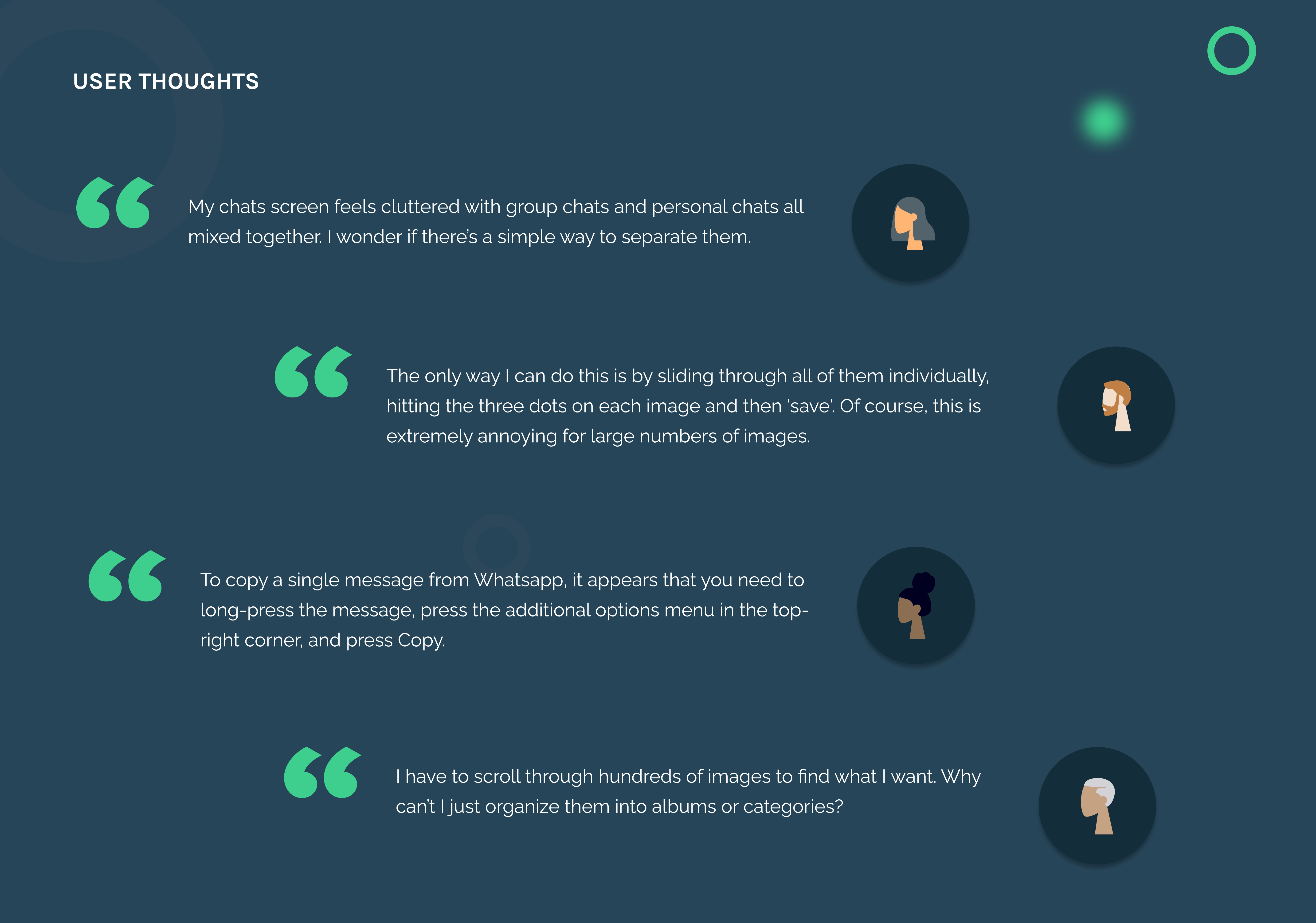 WhatsApp dumps all your media, links, and documents into a single tab respectively per chat, displaying everything in one long, chronological list. If you're trying to find a specific photo, receipt, or file, you're stuck scrolling through the entire feed, with no folders, albums, or tagging options to organize or retrieve content more easily.