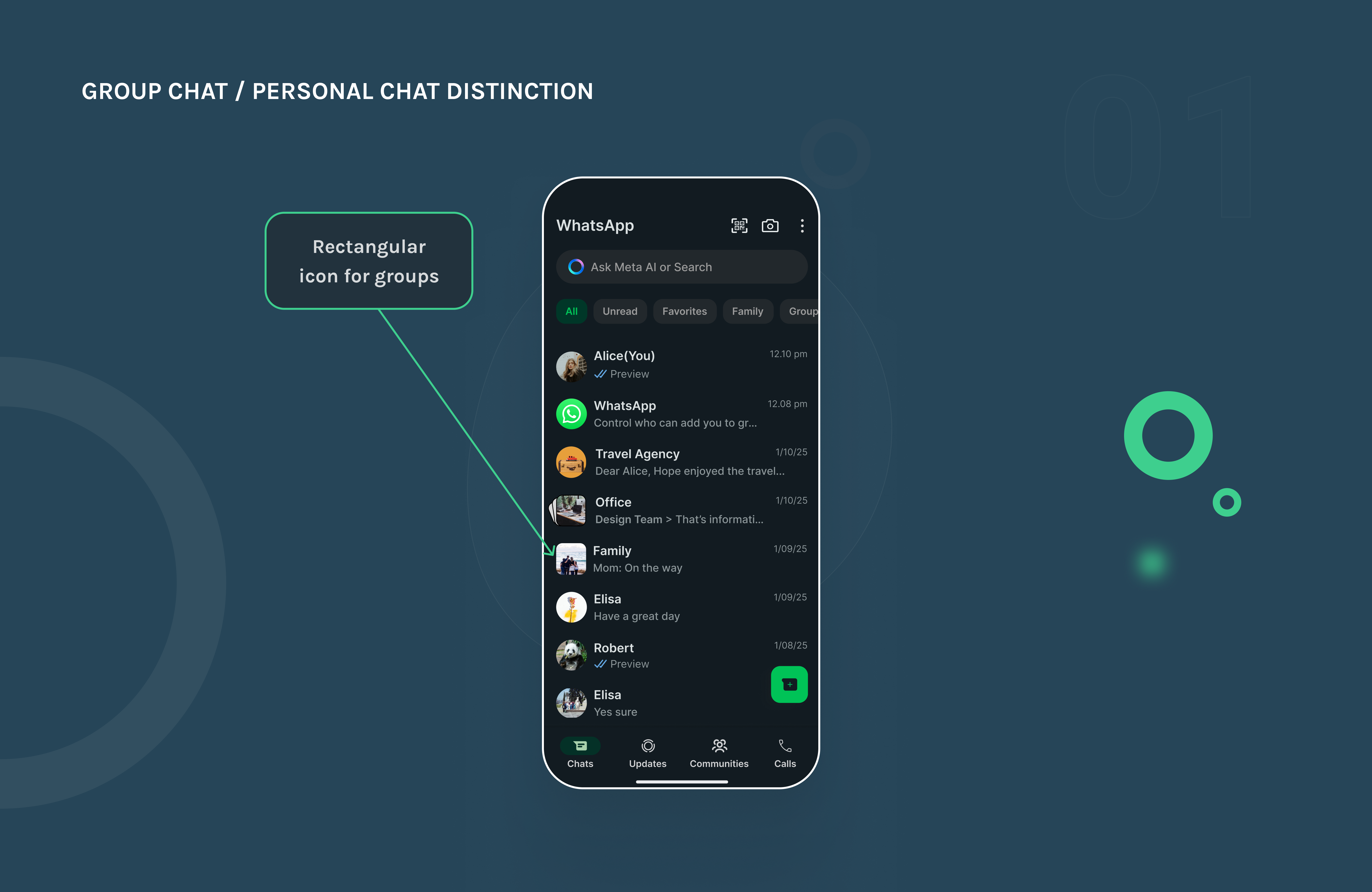 I added a distinct rectangular icon to group chats to visually separate them from personal conversations. This small but effective change makes it easier to scan the chat list and quickly spot group messages, reducing confusion and helping users stay organized across both personal and group interactions.