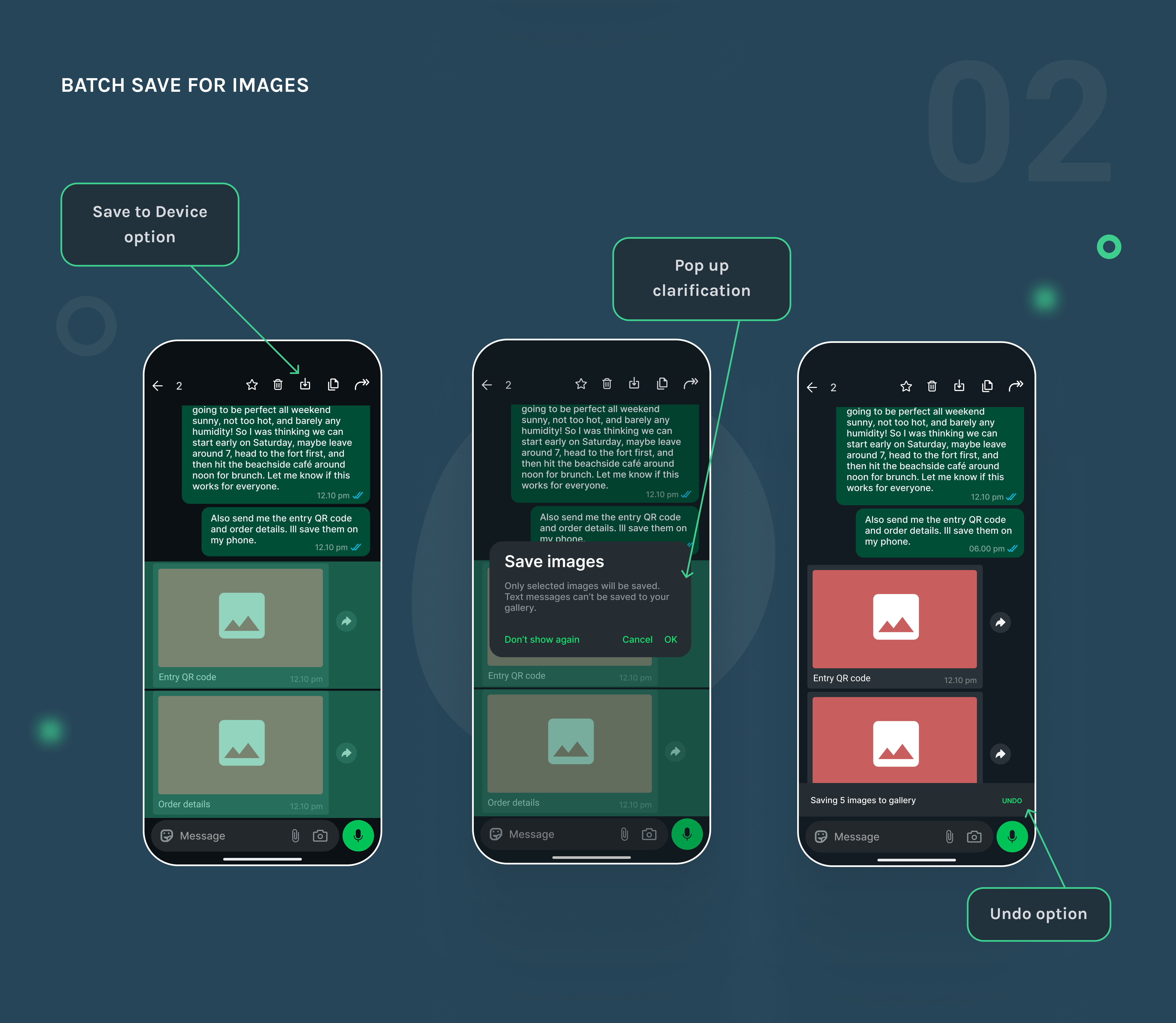 In my WhatsApp redesign, selecting multiple images (up to 5 for technical consistency and to avoid accidental bulk storage) shows a Save option in the top action bar, so users don't need to open and save each image one by one. This is especially useful for those who keep Media Visibility off to keep their gallery clean, allowing them to save only what they need. If a mix of images and text is selected, a pop up appears: "Save Images: Only selected images will be saved. Text messages can't be saved to your gallery." After saving, an Undo toast appears for quick reversal if needed. The result is a faster, cleaner way to manage important photos from trips, events, or work chats.