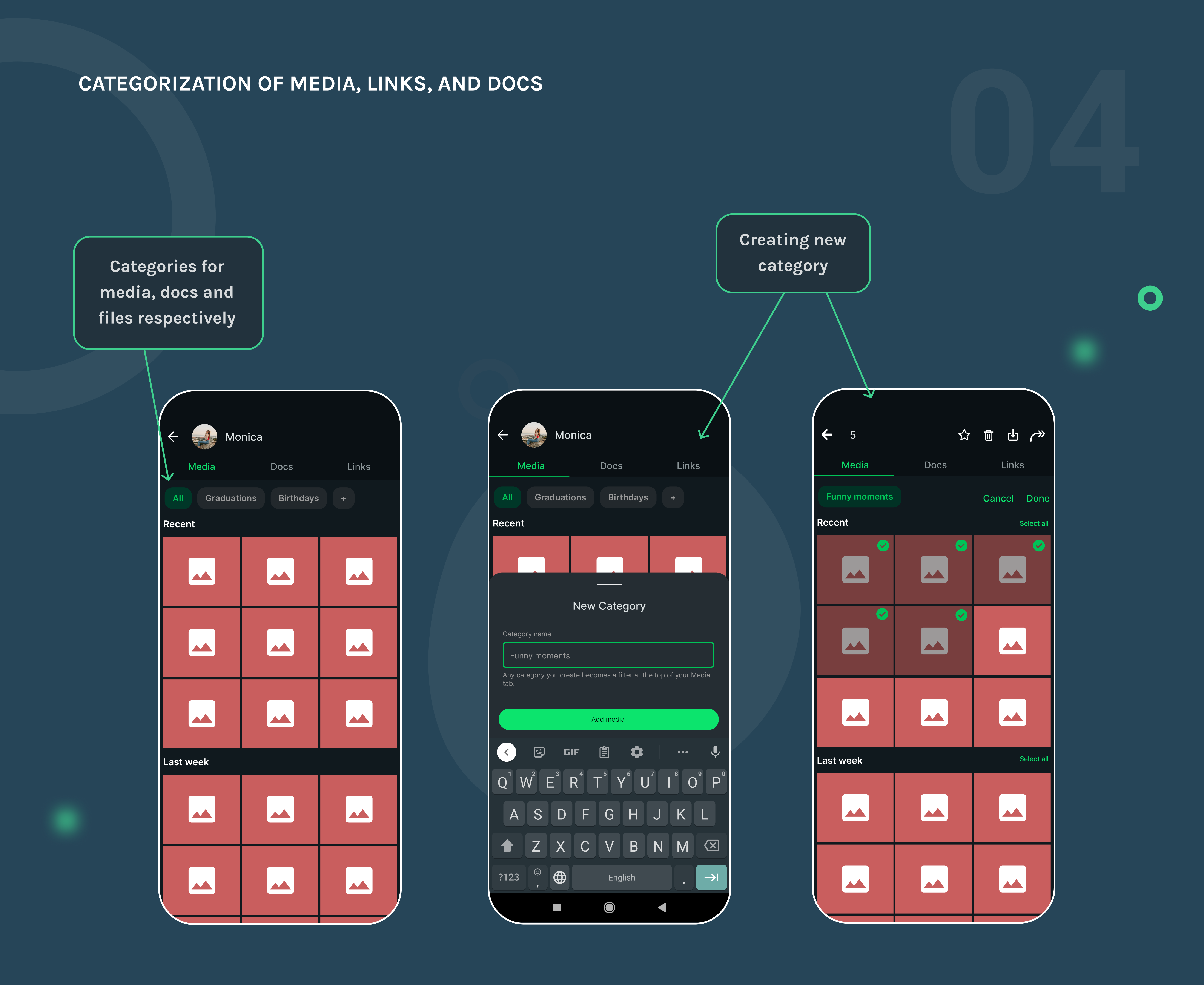 In my redesign, I introduced the ability to save media into custom categories, like "Receipts," "Travel," or "Funny Moments." This allows users to organize important files and photos directly within WhatsApp, without cluttering their phone's main gallery or using up Google Photos storage. It makes retrieving specific content quick and painless, eliminating the need for endless scrolling through a disorganized feed.