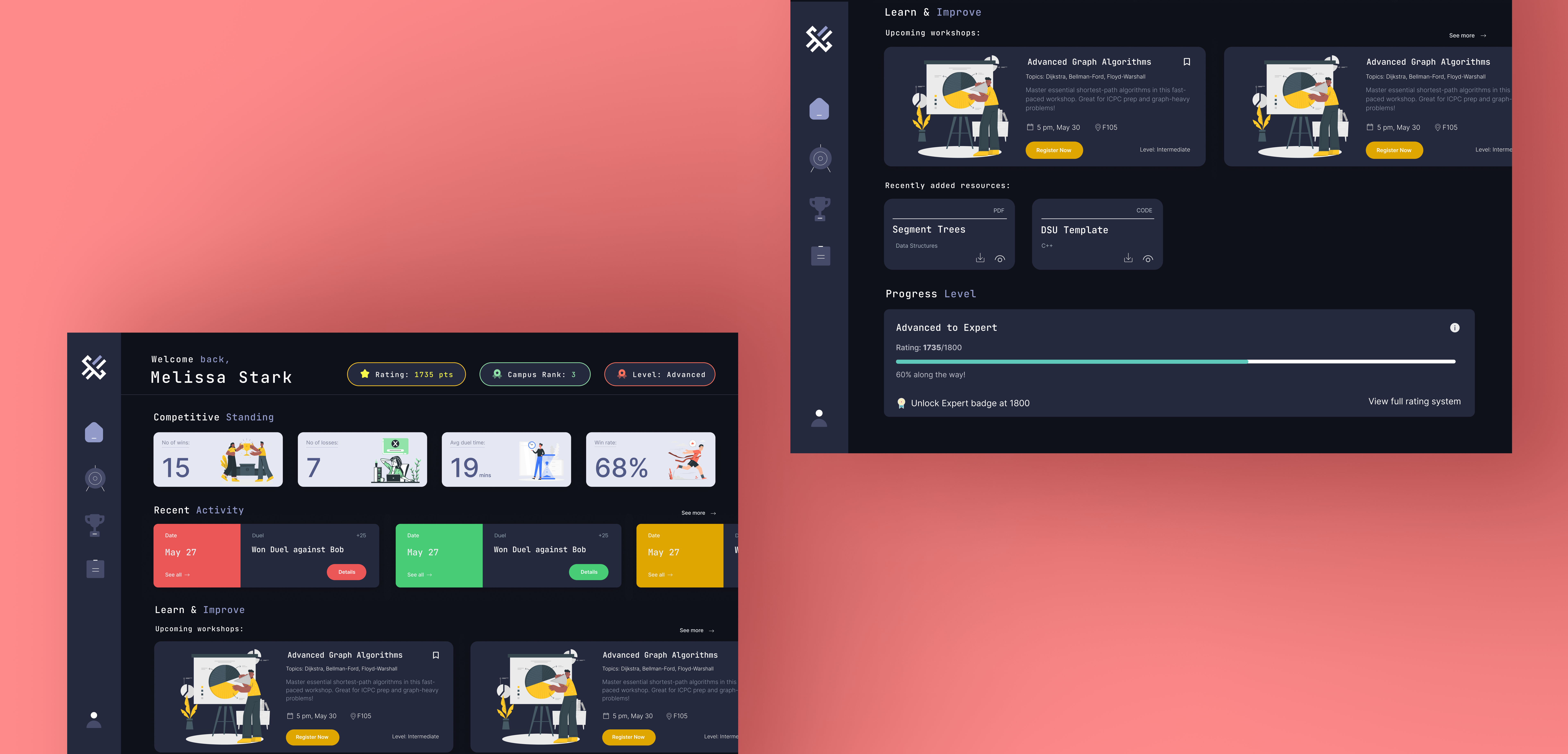 Designed user flows and visual UI for Surge, a competitive coding platform used campus-wide at BITS Hyderabad. Contributing to product design for RideShare, a campus cab-pooling app, covering trip creation, ride matching and real-time status flows end to end.