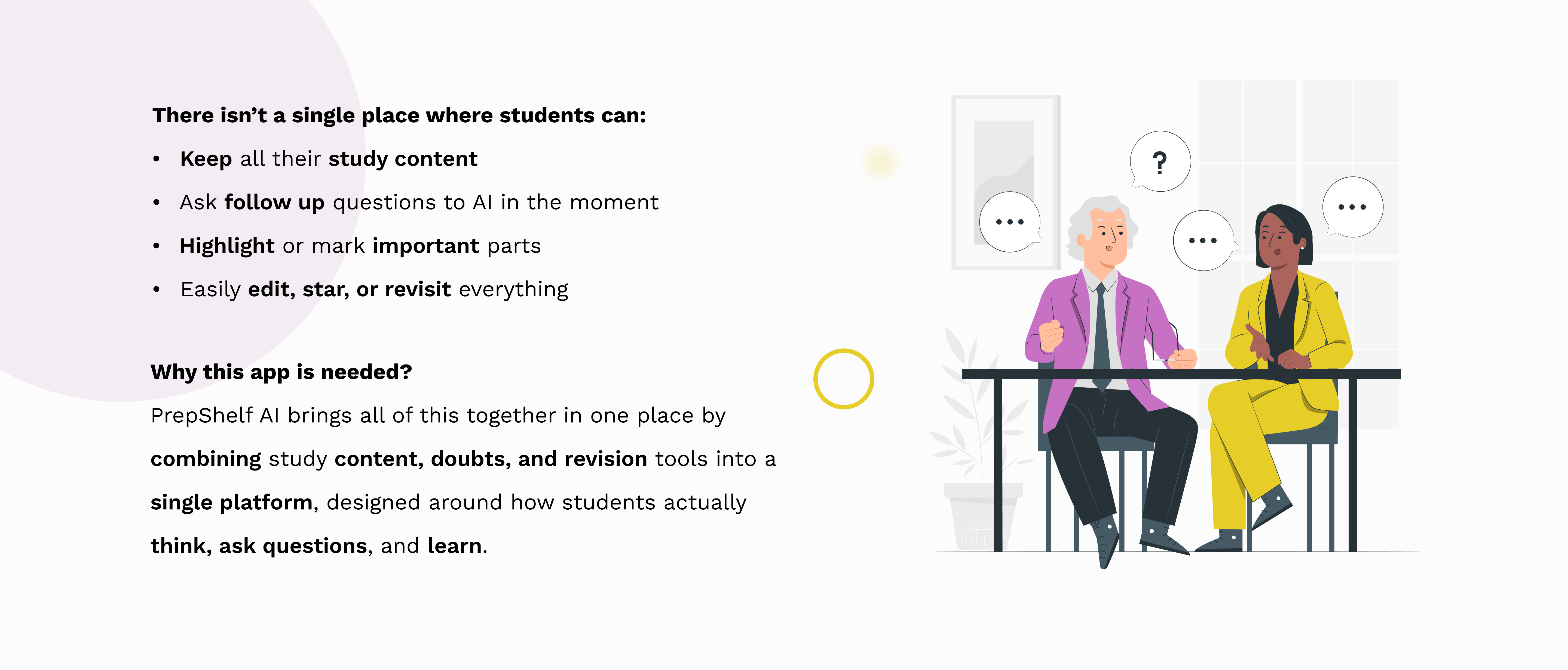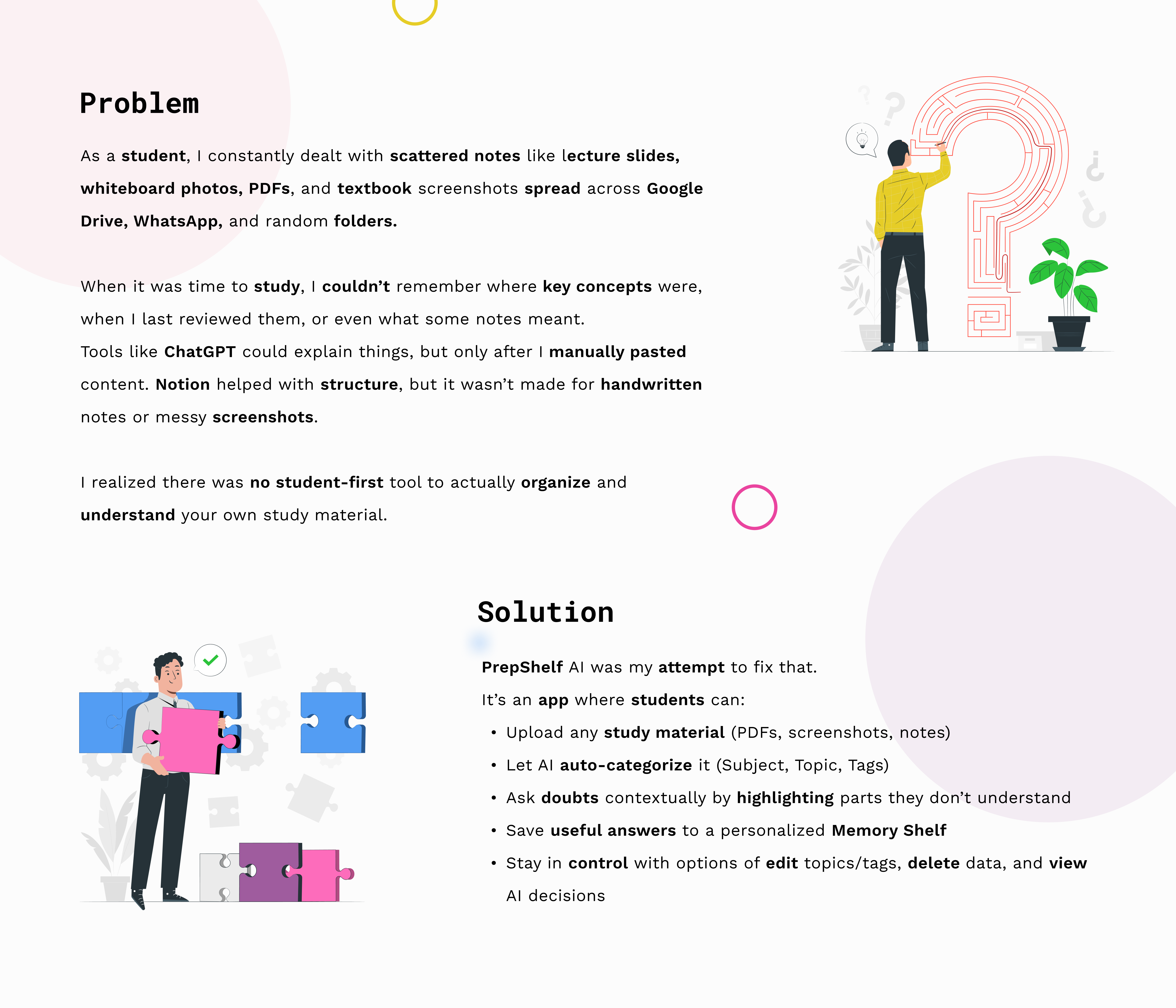 PrepShelf AI is a mobile-first study tool designed to help students organize, understand, and revisit their own study material in one place. It allows students to upload content in multiple formats, structure it by subject and topic, and interact with AI directly within their notes by highlighting specific sections and asking questions. By combining contextual AI assistance with smart organization and saved learnings, PrepShelf AI transforms scattered notes into a focused, interactive study experience.
