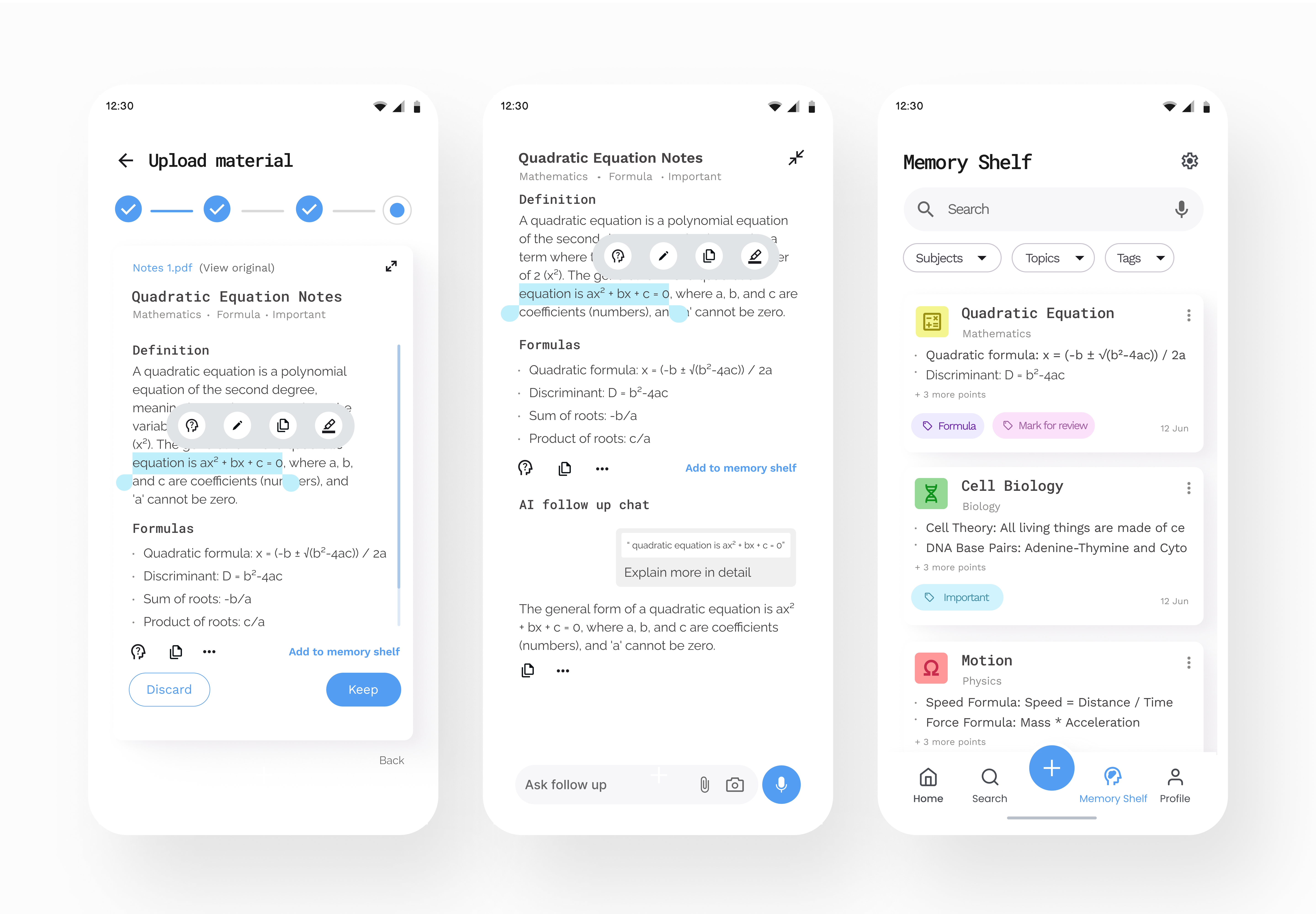 Students can select any part of their notes to edit, highlight, or copy using a quick action bar that appears on selection. They also have the option to start a quick follow up chat directly from the selected content. Conversations stay in the same place, keeping everything connected to the context. Important explanations, formulas, and key concepts can be saved for later. Everything is stored in a personal Memory Shelf for quick revision.